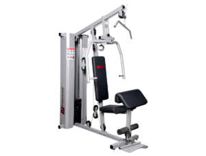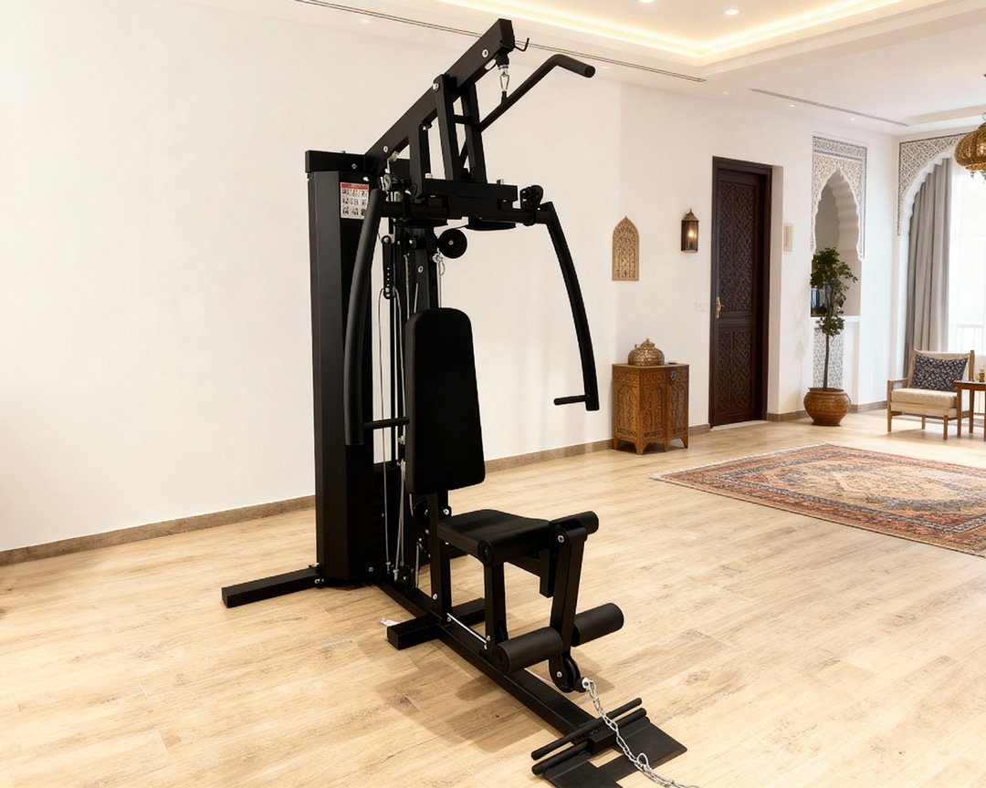Machine multifonction offrant plus de 14 exercices. Équipée de 60 kg de plaques de poids, elle est idéale pour le renforcement musculaire, le tirage dorsal, la presse et les exercices ciblés du haut et du bas du corps